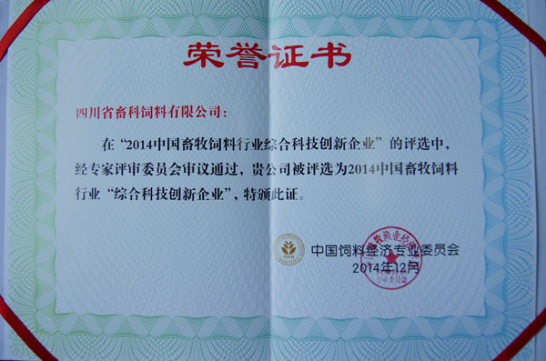 ——畜科榮獲2014年中國(guó)畜牧飼料行業(yè)“綜合科技創(chuàng)新企業(yè)”